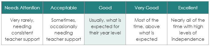 Classroom teachers and Specialists will provide feedback on students Behaviour and Effort in Sprint Feedback and Semester Reports. Within Semester Reports, Classroom Teachers will assess students through the following Teaching and Learning Expectation Statements: