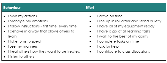 At Somerville Rise we have identified the main areas of the classroom that impact on our students' learning. These are broken into the categories of Behaviour and Effort.