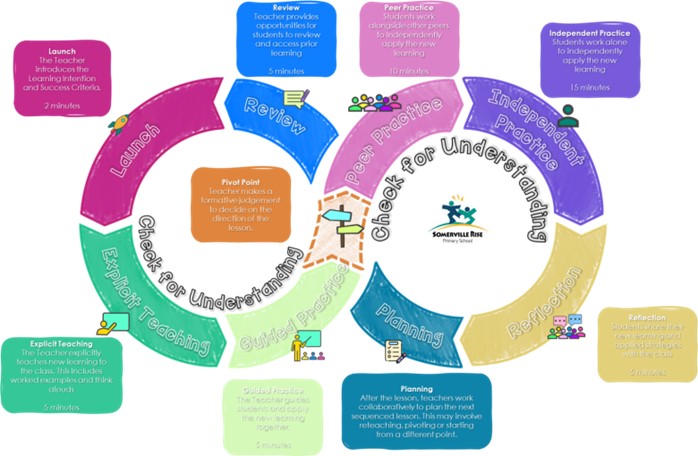 At Somerville Rise Primary School, our teaching and learning model is based on the Gradual Release of Responsibility framework and aligned with the Victorian Teaching and Learning Model 2.0 (VTLM 2.0). In simple terms, this means we carefully guide students from learning something new with strong teacher support to confidently applying it on their own.